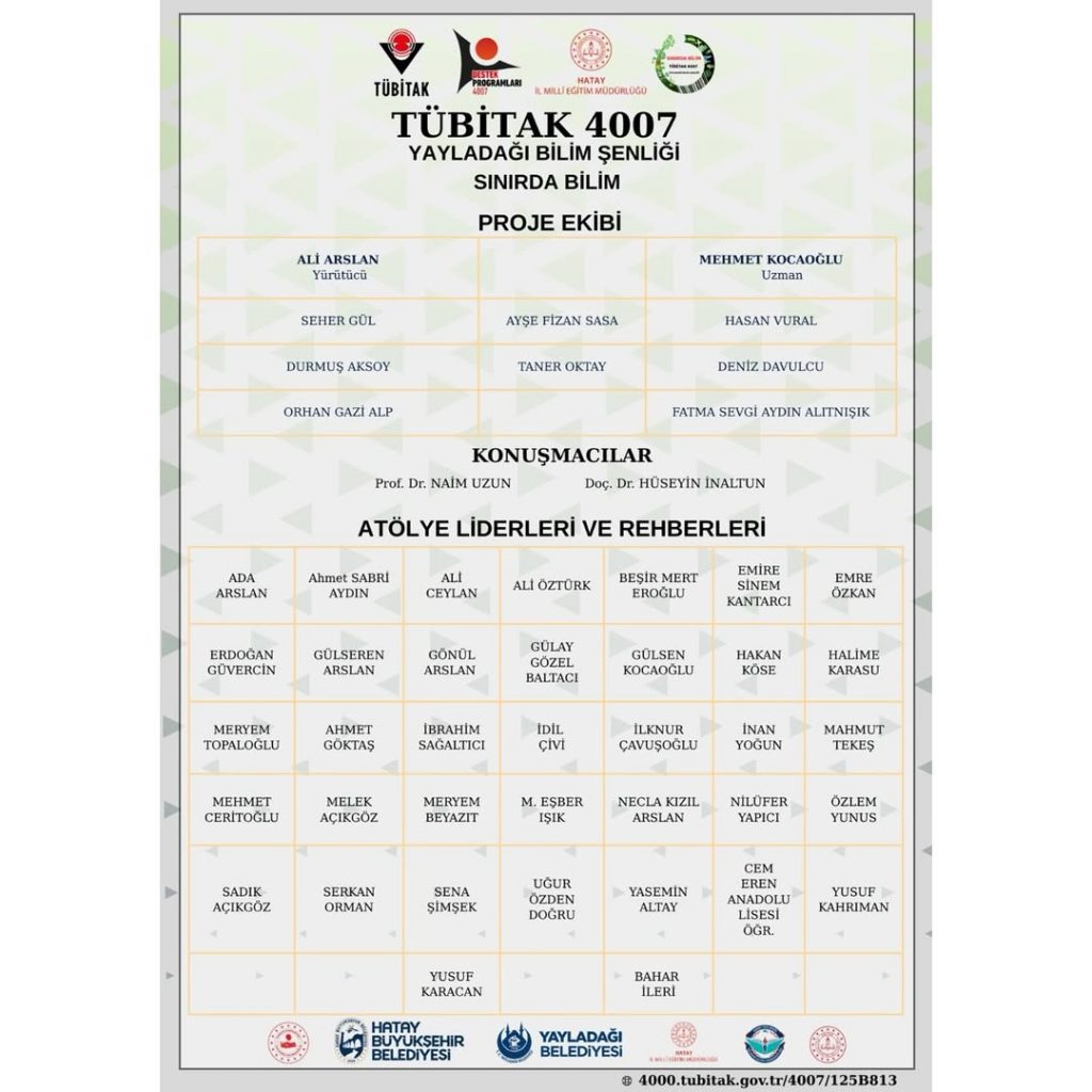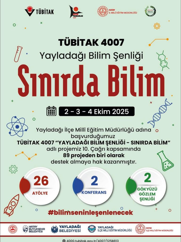 Yayladağı İlçe Milli Eğitim Müdürlüğü yürütücülüğünde, Hatay Büyükşehir Belediyesi, Yayladağı Belediyesi ve Hatay İl Milli Eğitim Müdürlüğü iş birliğiyle düzenlenecek olan etkinlik, 26 atölye, 2 konferans ve 2 gökyüzü gözlem şenliğini bilim meraklılarıyla buluşturacak. Proje, Yayladağı Belediyesi Devrent Sosyal Tesisleri’nde 3 gün sürecek.